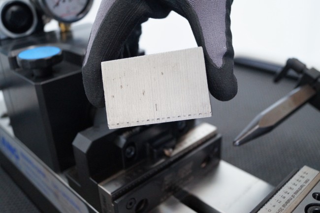 Die Mittenmarkierung wird an der beweglichen Backe der Prägestation oberhalb der Prägebacke montiert. Bei montierter Mittenmarkiervorrichtung wird das Rohmaterial neben der Prägekontur gleichzeitig mit einer kleinen Einkerbung versehen. Diese erleichtert das exakt mittige Einlegen der Werkstückrohlinge im 5-Achs-Spanner, auf dessen skalierten Spannbacken die „0“-Markierung die Mitte anzeigt. Anschläge werden somit kaum noch benötigt.