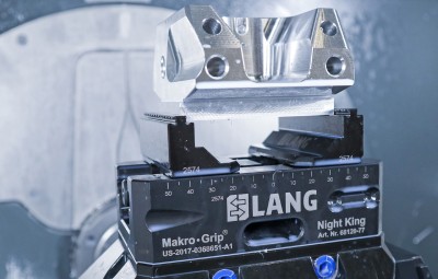With the Makro•Grip® Night King, LANG Technik presents a pure raw part vice that is specifically designed for accessibility and holding force and thus serves the essential requirements of 5-axis machining. The new 5-axis vice offers an excellent value-for-money ratio and knows how to fully convince with the benefits of the proven LANG stamping technology. Particularly in larger quantities, e.g. when used with LANG's RoboTrex automation, its favorable purchase price pays off and ensures high cost savings. It is also a thoroughly attractive option for multiple clamping systems of all kinds, such as on clamping towers for horizontal centers or clamping bridges. The Makro•Grip® Night King is 100% Made in Germany and available from €345 (Prices may vary depending on sales region and country). The Night King is available in a version with a jaw width of 77 mm and a max. clamping range of 120 mm. On the side surfaces of its base body there are grooves for mounting on the RoboTrex 52 automation trolley as well as for the robot gripper. Thanks to the new gripper exchange interface on the RoboTrex 96 robot, the Night King can be used not only with RoboTrex 52, but also here.