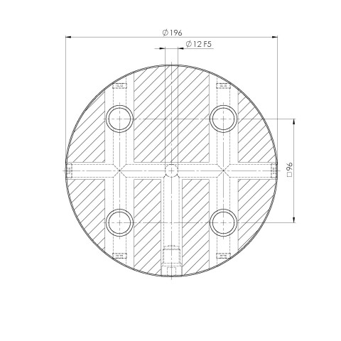 The Quick•Point® 96 round plate with a diameter of 196 mm can be provided with individual mounting holes to attach it to rotary tables and trunnions. Example possibilities are Haas TR 200, Fanuc Robodrill/Häberle and Lehmann rotary tables, as well as the rotary table of the Hurco VMX 42 with cross-shaped slot.