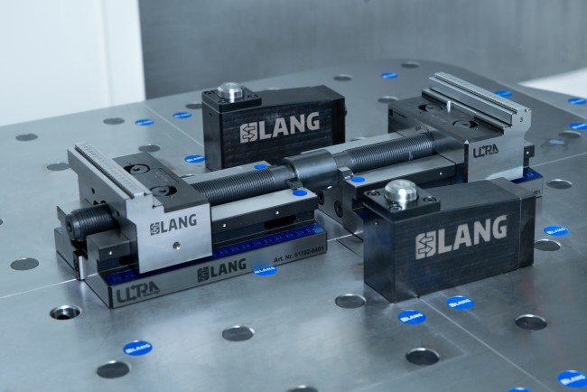 El Makro•Grip® Ultra Base Set "S" con una altura de 45 mm consta de dos cuerpos de base largos (192 mm) cada uno, que dan como resultado un alcance de sujeción máximo de 410 mm. El juego también incluye una unidad de husillo, placas de centrado y accesorios. Las mordazas de sujeción están disponibles por separado. Con un rango de sujeción de 410 mm, este juego de bases ofrece un rango de sujeción ligeramente superior en comparación con el tornillo de banco de 5 ejes más largo, en caso de que los 355 mm del tornillo de banco de 5 ejes sean insuficientes.