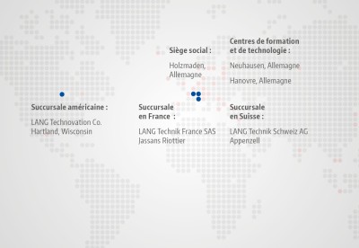 En 2008, la filiale LANG Technik USA a été créée à Waukesha, WI, afin d'assurer un suivi des clients américains directement sur place. Cependant, en raison de la forte croissance, les locaux sont rapidement devenus trop petits, raison pour laquelle l'entreprise a déménagé en 2010 dans un bâtiment plus grand à Hartland, WI. Celui-ci abrite aujourd'hui un bureau de vente, un entrepôt offrant une capacité de réaction rapide et une grande capacité de livraison, ainsi qu'une surface de production équipée de machines de fraisage et de mesure pour les prestations de service.