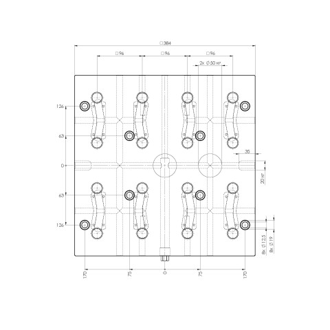 Quick•Point® 96, Piastra a griglia 4 volte, 384 x 384 x 27 mm, con fori di montaggio per una distanza tra le fessure di 63 mm Articolo n. 45741